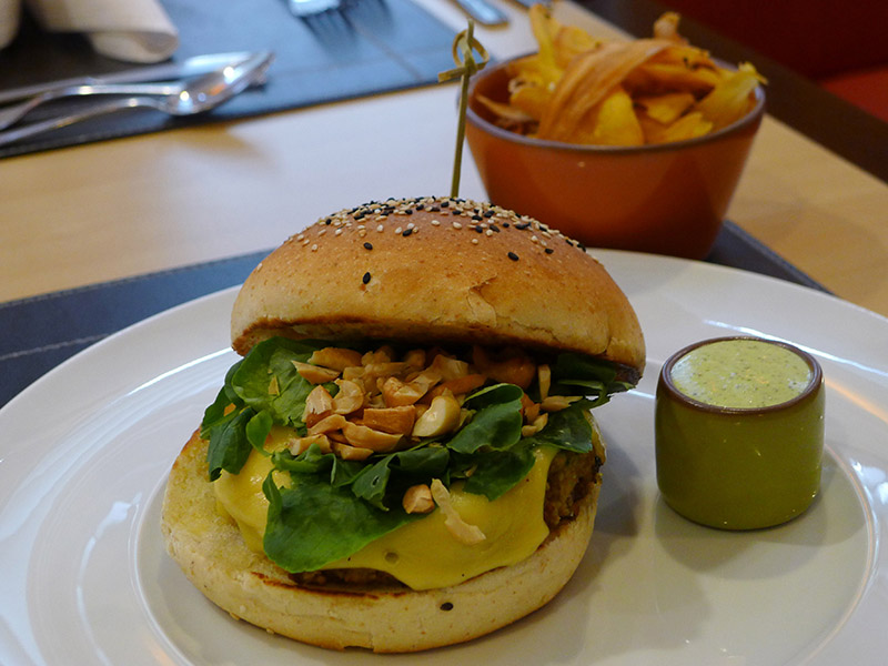 Rellene el pan de hamburguesa con el Burger de calabaza. Disponga el berro y las castañas de cajú sobre él. Condimente con salsa aioli y sirva con papas fritas o ensalada verde.