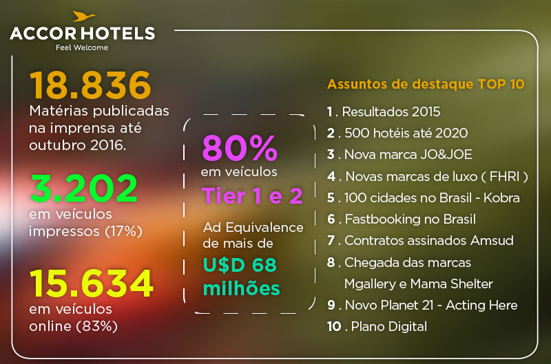 Eleita em 2016 pela segunda vez consecutiva uma das Empresas que Melhor se Comunicam com os Jornalistas, na categoria Hotelaria e Turismo, a AccorHotels realiza um intenso trabalho para comunicar à imprensa suas marcas e estratégias.