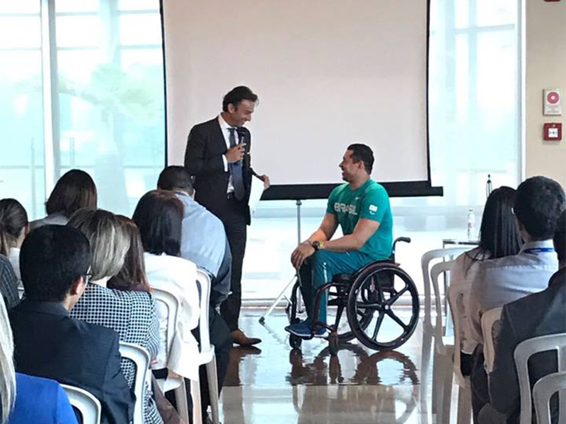 O medalhista paralímpico abriu o evento realizado na Sede, em São Paulo, na manhã de 1 de dezembro, com uma palestra bem-humorada e emocionante, com a presença de Patrick Mendes, CEO AccorHotels América do Sul, Fernando Viriato, VP de Talento & Cultura, além de colaboradores. O nadador contou a história da sua vida e mostrou que, com determinação e alegria é possível superar os obstáculos. “Na vida, temos metas e objetivos e é preciso ter foco para atingir o sucesso”, incentiva.