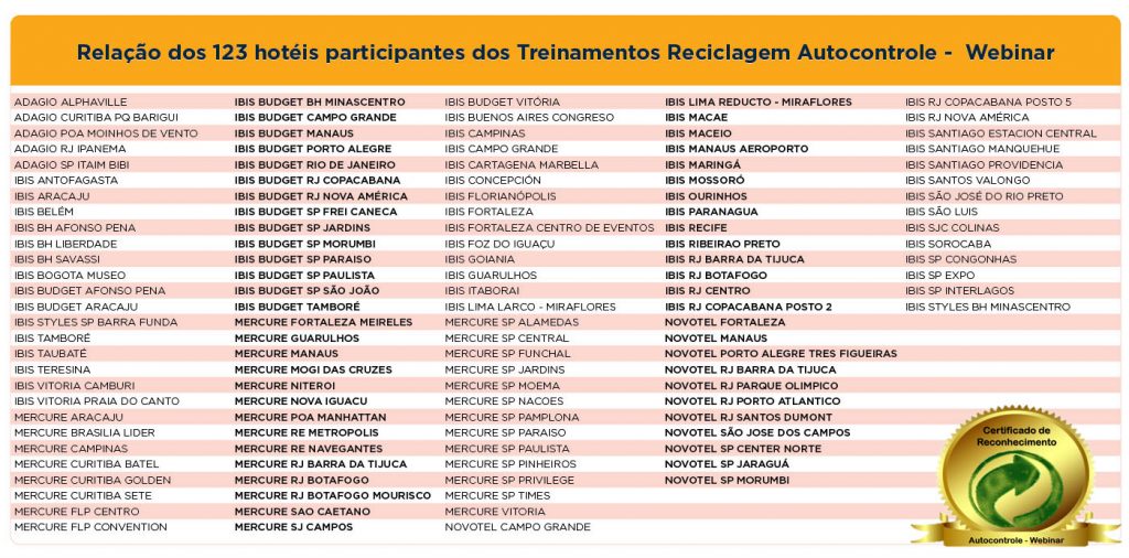 Ao todo, foram realizadas 37 sessões para 433 colaboradores de 123 hotéis das marcas ibis budget, ibis, ibis Styles, Adagio, Mercure e Novotel do Brasil, Argentina, Chile, Colômbia e Peru. Os treinamentos abordaram os temas vendas de hospedagem, Alimentos & Bebidas e Tesouraria. “Parabenizamos cada unidade por ter participado da reciclagem. Agora, esses hotéis também são responsáveis por multiplicar essas informações a outros colaboradores”, destaca.