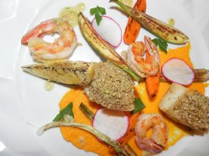 Em uma frigideira, tostar a abobrinha e a cenoura temperada. Servir o peixe com purê de abóbora, o camarão grelhado e os vegetais. Regue com a emulsão e sirva.