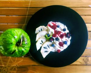 Em uma tigela bonita para dar uma boa apresentação ao prato, colocar uma base de cream cheese, um pouco de molho de frutas vermelhas, polpa da chirimoya e os suspiros em pedacinhos. Repetir esse procedimento até terminar os ingredientes, deixar para acrescentar as frutas do campo por último dando uma bela apresentação à sobremesa. Manter na geladeira por duas horas e desfrutá-la. Se você quiser, também poderá acrescentar um pouco de creme chantilly.