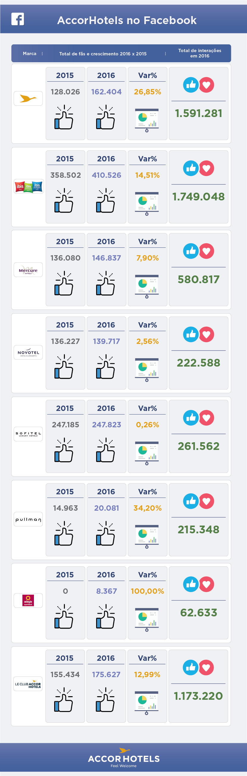Cada vez mais, a AccorHotels e suas marcas ganham a simpatia do público nas redes sociais, aumentando a visibilidade dos produtos e dos serviços oferecidos para os hóspedes. No Facebook, o engajamento está crescendo a todo vapor! Confira alguns números de 2016: