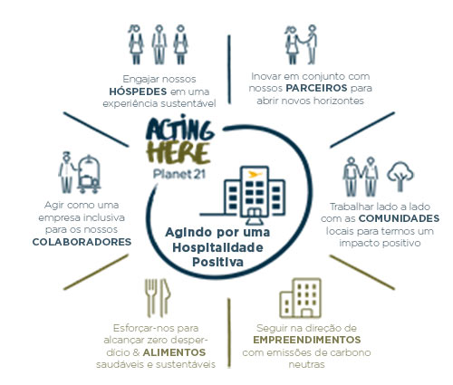 O novo Planet 21 está estruturado em seis pilares, sendo quatro áreas-foco estratégicas, dedicadas aos públicos com os quais a AccorHotels se relaciona, Colaboradores, Clientes, Parceiros e Comunidades Locais, e duas áreas-foco consideradas os principais desafios para os próximos cinco anos: Alimentos & Bebidas e Empreendimentos. O hotel está no centro de todos os pilares.