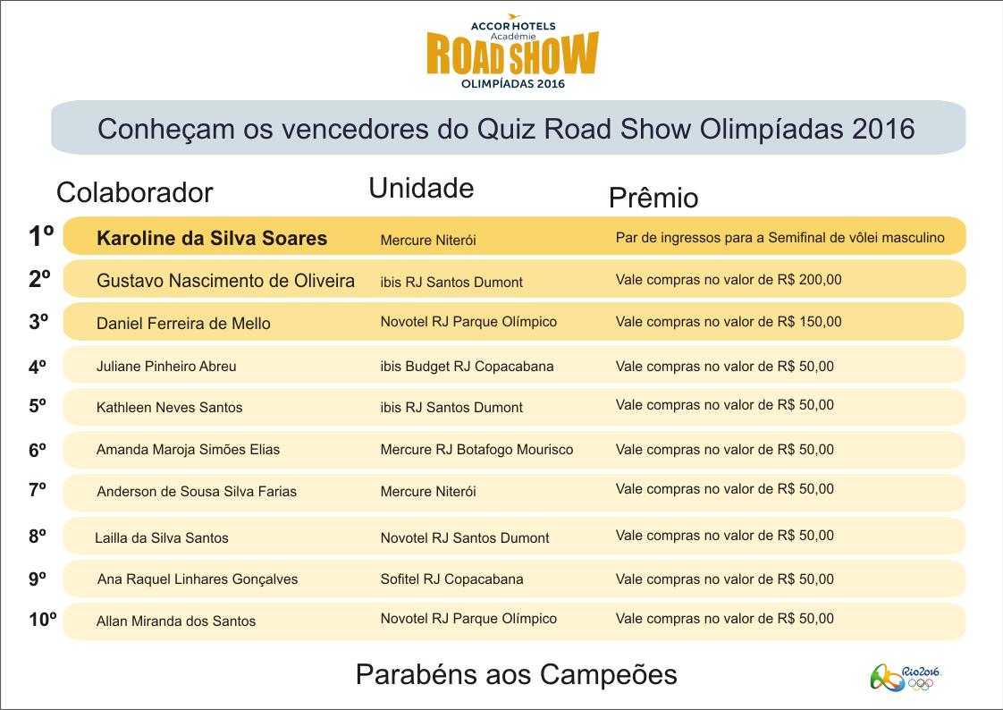 O conteúdo transmitido durante o Road Show foi reforçado em um quiz online para todos os colaboradores em testes de conhecimento sobre tudo o que foi abordado nas capacitações presenciais. Os melhores participantes do quiz foram premiados com ingressos para a semifinal do vôlei masculino e vouchers para compra de artigos esportivos. Confira os vencedores.